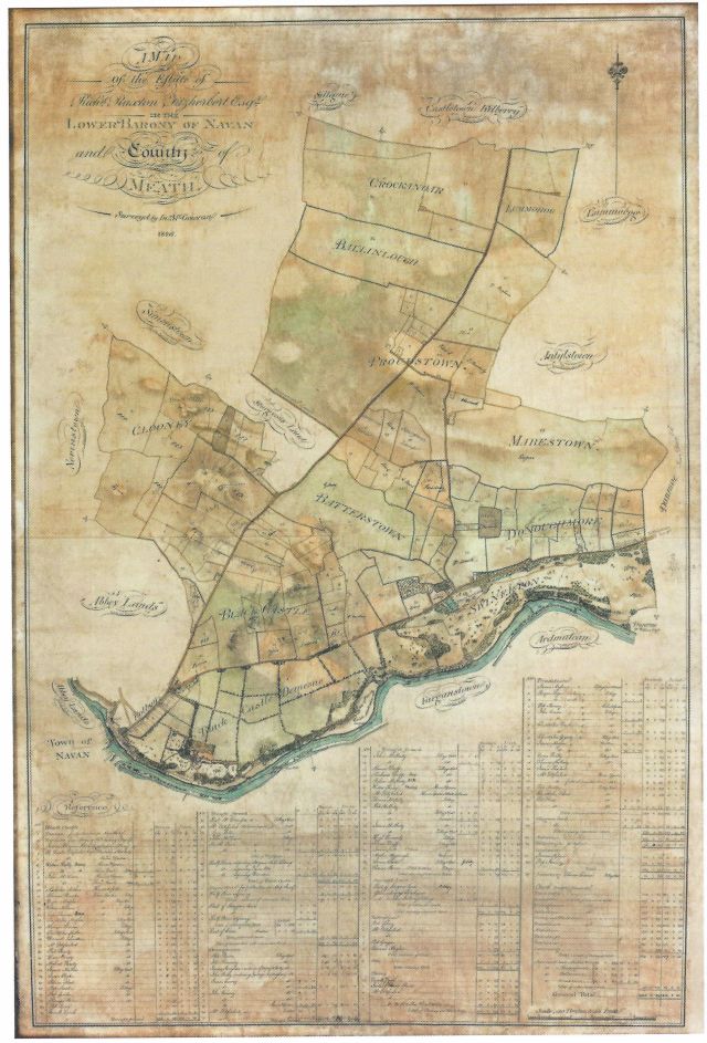 A feature of Navan’s history in the three hundred years between 1600 and 1900, when the landlord system shaped much of Irish society, was the fractured nature of land ownership around the town. Different parts of the town fell within different landed estates. These included the Earl of Essex, Lord de Ros, the Duke of Bedford, the Earl of Howth and the Ruxton-Fitzherbert family of Blackcastle. All but the Ruxton-Fitzherberts were absentee so that we know that by the nineteenth century most of the town’s property was managed from London (Essex, Bedford), Dublin (Howth) and Strangford, Co. Down (de Ros). From 1770 onwards, when John Ruxton married Margaret Edgeworth and came to live at Blackcastle and his brother Samuel Fitzherbert took up residence at Swinnerton, the family ran an estate comprising just over 2,000 acres which played an important role in the life of the town.