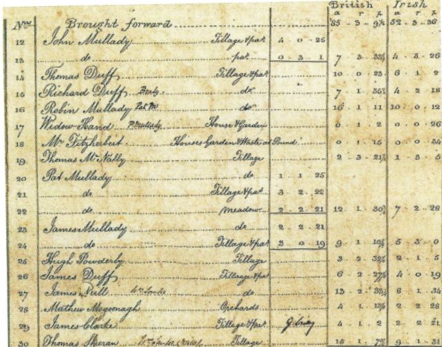 In terms of continuity between 1796 and 1826 the names listed above are the exception rather than the rule. In other words, there appears to have been a very high turnover of tenants on the estate in the thirty years between 1796 and 1826. This was quite a turbulent time in Irish economic history with a boom in agriculture through the late 1790s and the early years of the nineteenth century which corresponded with Britain being at war with France. Wartime demand for agricultural produce from Ireland led to rising prices and rents. Some tenant farmers did very well from this boom while others found it difficult to pay higher rents as their leases fell in and were forced to give up their holdings.